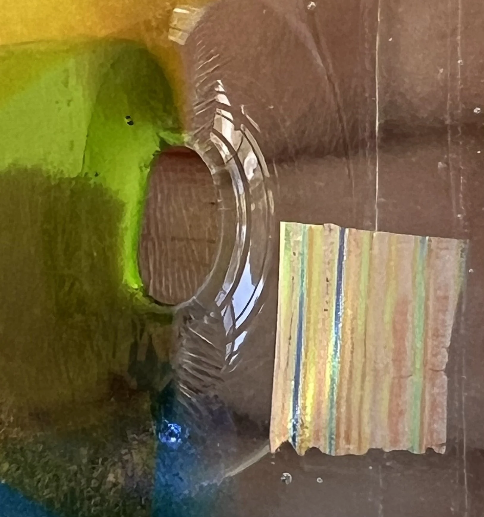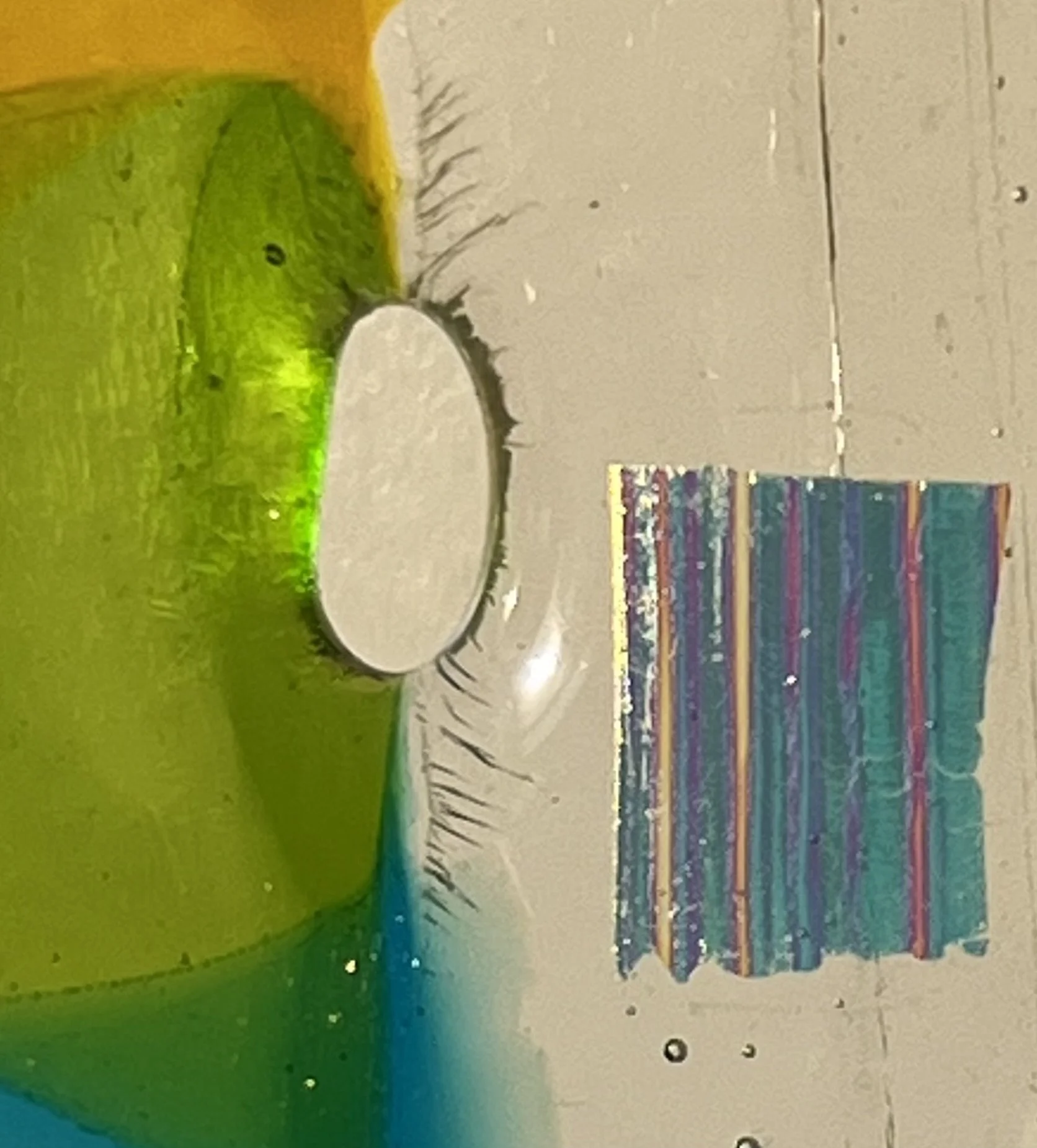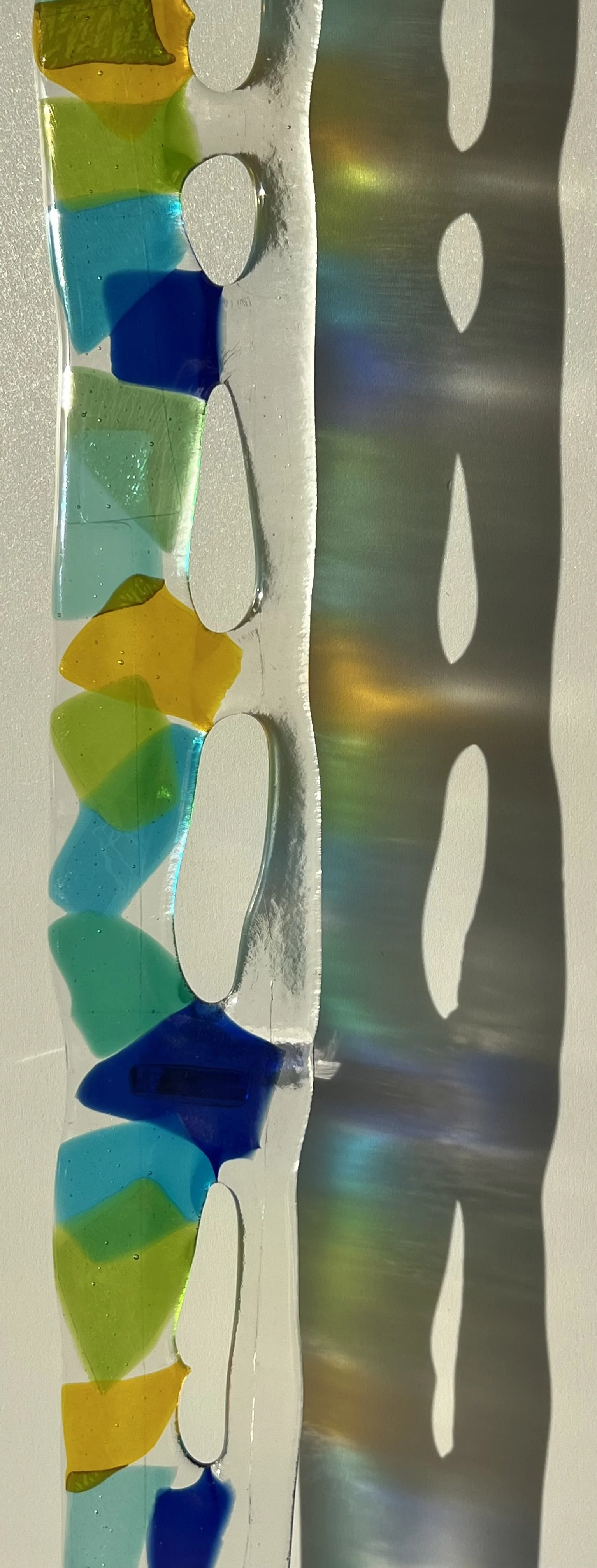 Each shadow line includes a small piece of dichroic coated glass. It appears differently when transmitting or reflecting light. Here on clear glass it shows blues and purple, while putting a hand behind the glass makes it reflect and metallic gold plus other colors.