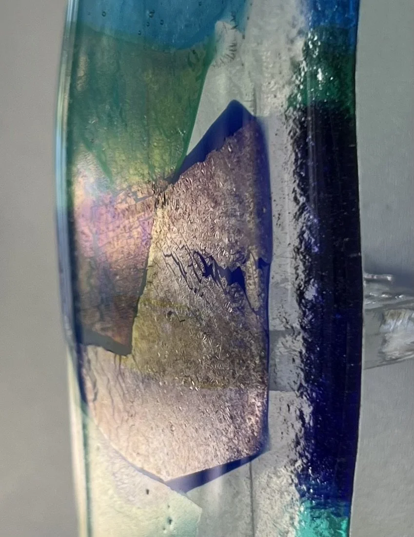 What seems like various small pieces of transparent colored glass sometimes show an iridescent or metallic coating depending upon the light source and observation angle.