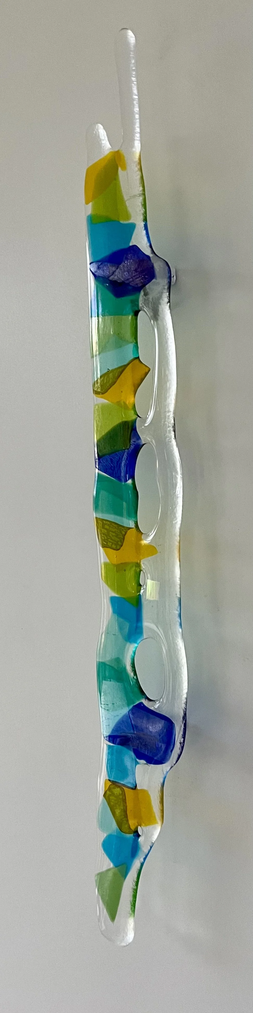 With direct spot light, the glass colors appear in the shadows on the wall behind the glass. Holes in the glass make the wall glass shadows look three dimensional.